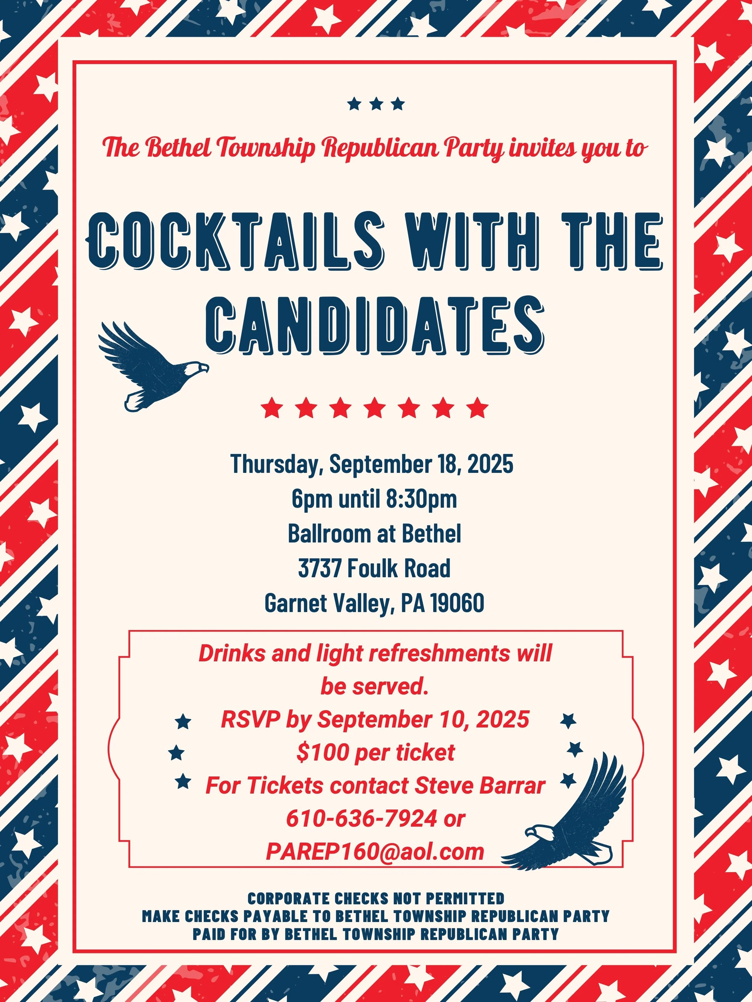 By providing your phone number and checking this box, you are consenting to receive text messages from the Bethel Township Republican Party. Donations will not be solicited. Msg & data rates may apply. Message frequency varies. Reply STOP to opt-out, reply Help for help. Terms and Conditions/Privacy Policy Apply.